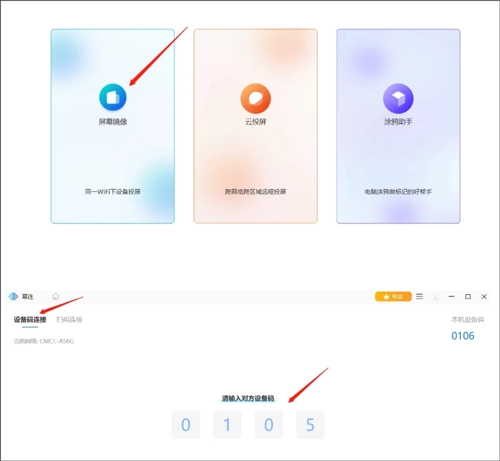 3、在电脑端幕连投屏软件中点击【屏幕镜像】-【设备码连接】。