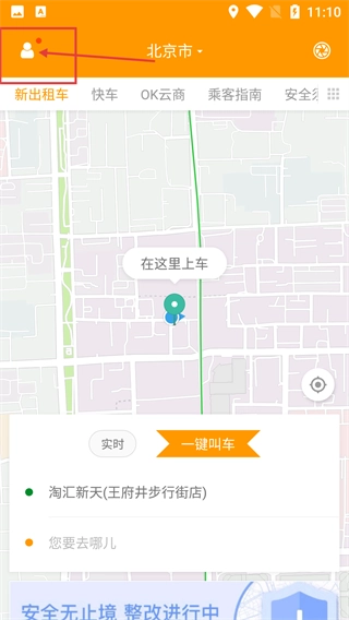 1、进入打车应用主界面,点击左上角图标可进入个人中心。