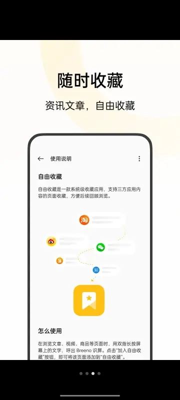 1.支持资讯文章、微博、微信公众号、视频平台(如腾讯视频、爱奇艺)、电商平台(如淘宝、京东)等50多个应用的内容收藏1。