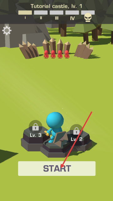 1、点击【START】按钮,启动【Tutorial-castle,-lv.-1】的战斗挑战,进入士兵对战阶段。