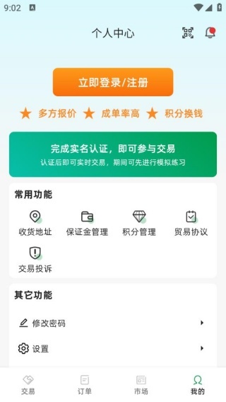 3、进入我的界面,完成实名认证后,即可参与交易,各项功能支持便捷设置。