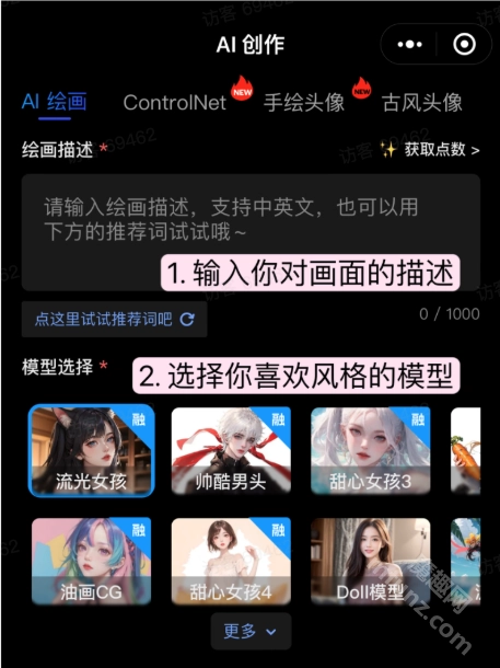 1、绘画描述:输入各种文本内容或者关键词对想要绘制的图片进行描述;
