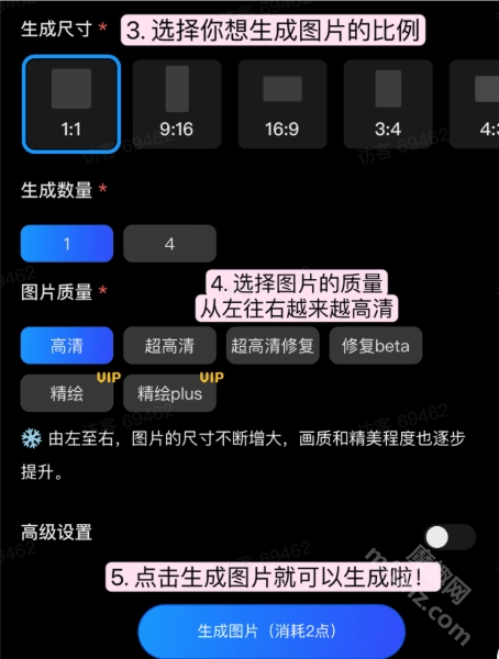 3、生成图片:点击生成按钮根据个人完善的描述内容生成相关的图片作品;