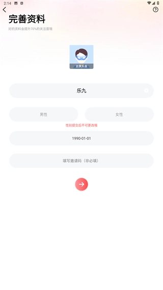 1、在完善资料页,填写昵称、性别、生日等信息后,点击箭头按钮提交资料。