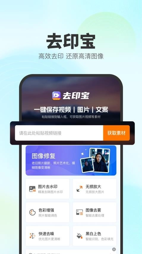 去印宝是一款非常好用且实用的手机去水印软件,可以帮助我们去除掉图片上的水印。而且不管是视频还是图片,去印宝软件都可以一键去除其中的水印。如果我们是视频创作者,想对抖音、快手等平台上的视频进行二次创作,还可以复制视频链接进行视频的无水印提取。此外,去印宝还提供了一些图片编辑功能供我们自由使用噢!