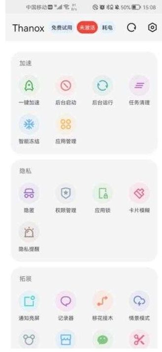 1、接着打开Thanox权限管理软件,在正式使用该软件前,我们得先熟悉它的主要功能模式,其中首要的便是激活模式,不同模式下用户能够尝试的功能存在差异。