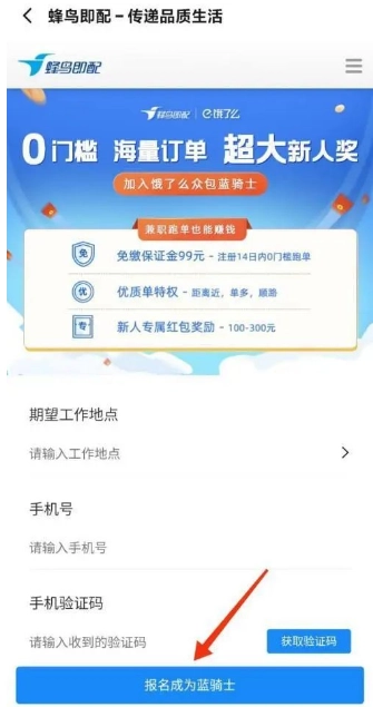 3.填写相关信息,点击底部的【报名成为蓝骑士】即可注册成为饿了么外卖骑手!