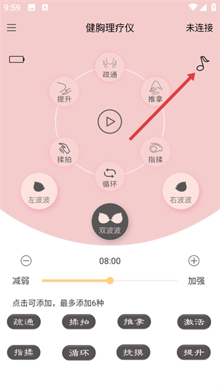 2、进入健胸理疗仪页面后,从下方功能栏选择【疏通-揉拍】等模式(最多选6种),配置理疗方案。