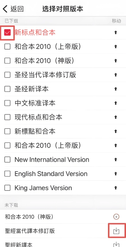 3、在选择对照版本页面,勾选你想要对照的圣经译本(未的需先)。