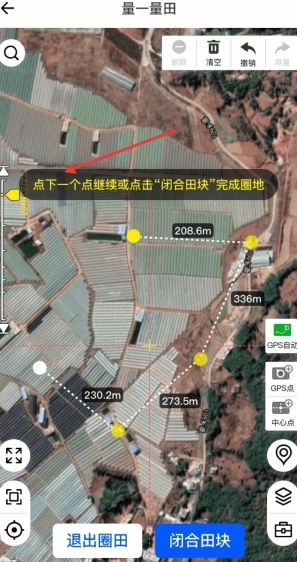 3、进入量一量田的界面,按照提示进行操作,在地图上点击合适的位置来选择下一个点,持续圈定田块的范围。
