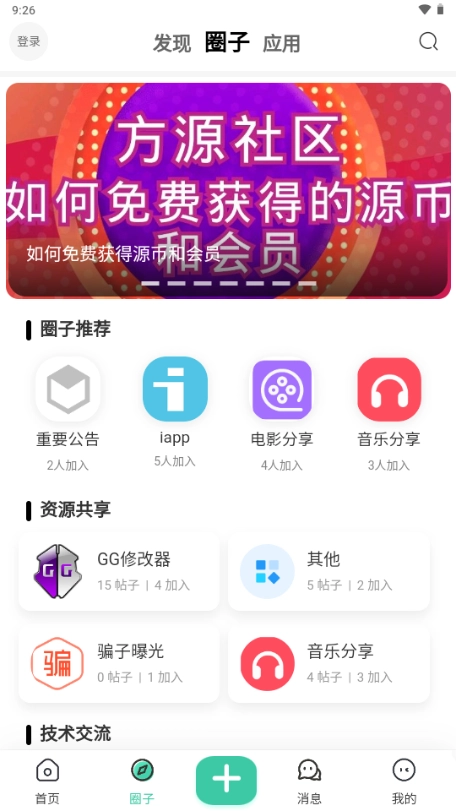 2. 点击“圈子”选项,可以看到非常多优秀的应用资源。
