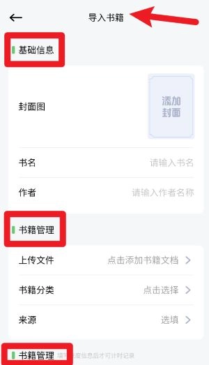 3、在“导入书籍”页面填写基本信息,上传文件分类即可导入书籍。