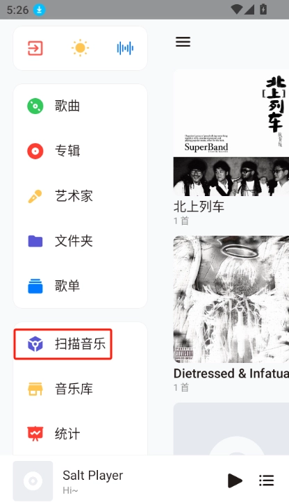 1.Salt Player会自动扫描设备上的音乐文件,并在应用内建立音乐库。直接点击扫描音乐,然后手动选择扫描特定文件夹,以便更快地找到你的音乐。
