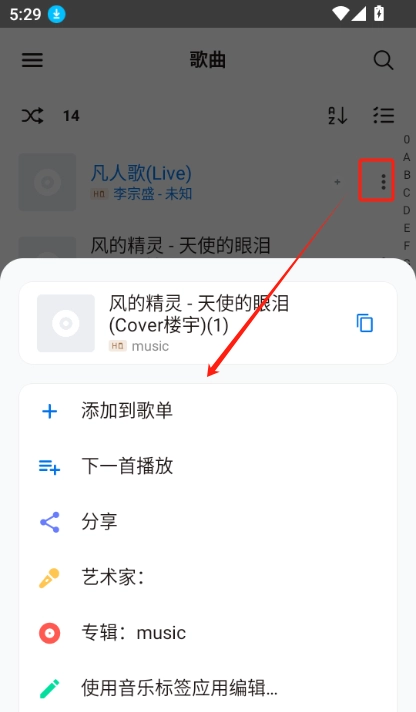 5.点击歌曲右边的【...】可以添加到歌单或者分享。