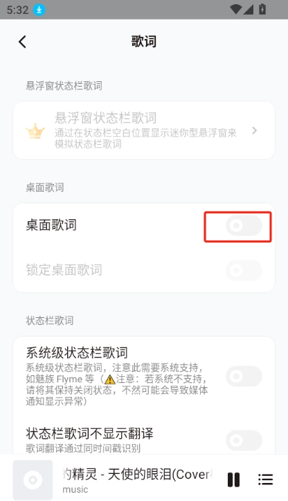 4.在歌词设置中,您可以选择开启“状态栏歌词”功能,这样歌词就会显示在状态栏中。
