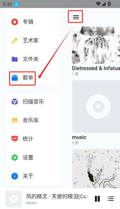1.打开Salt Player,点击左上角三个横杠。点击“歌单”进入。