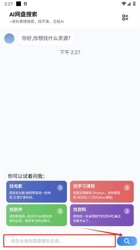 ai网盘搜索是一款专门帮助我们资源的手机网盘资源搜索工具,各种资源都可以快速找到!并且可以的资源类型丰富,例如应用工具、学习资料、游戏、音乐,视频等。只要我们想找,ai网盘搜索都能尽力帮自己找到。ai网盘搜索软件最大的特色就是了AI搜索功能,我们只要输入自己想找的资源名称或者相关描述,AI就能自动提取关键信息,然后给我们反馈相应的资源!而且ai网盘搜索还支持多个网盘资源,像兄弟盘、UP云搜、蓝奏云等,非常不错!