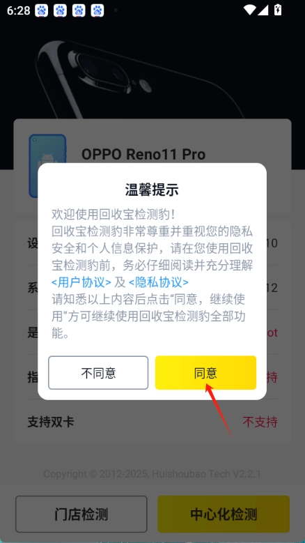 1.打开检测豹后,点击“同意”按钮,授权应用访问手机硬件和系统信息