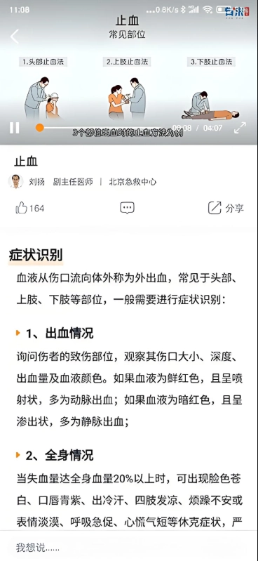 3、比如下面这个【止血】就非常详细,当你遇到特殊情况时不知怎么办,可以打开这个查看解决办法;