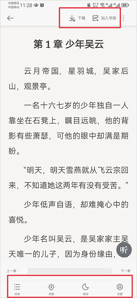 2、选好小说后直接点开就能阅读,点击屏幕可呼出菜单,用户可以把它加入书架,也能查看目录、调节亮度或进行更多设置等操作。