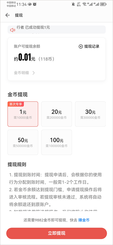2、当金币余额满足提现要求时,提交提现申请后会进入审核环节。若提现审核未通过,系统会自动把相关余额退回至原账户。