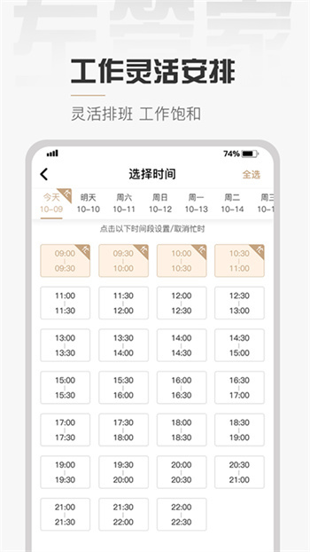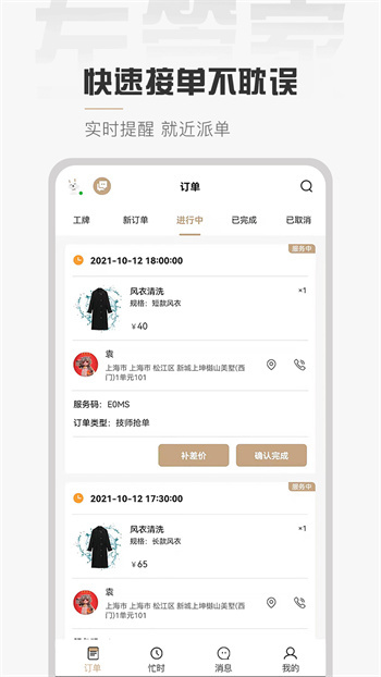 技师可随时在线查询订单,自主设置接单时段,灵活规划个人工作安排。