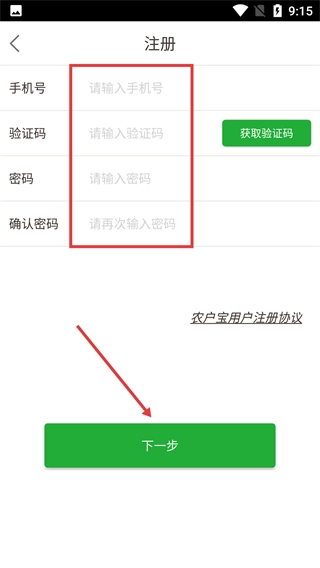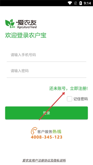 1、在【农户宝】登录页面,点击【还未账号,立即注册!】选项,进入账号注册页面。