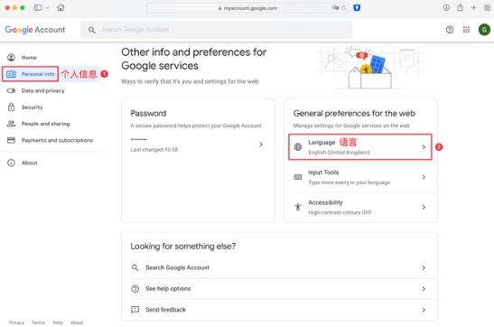 3、点击个人信息,点击“Language”修改语言为中文。