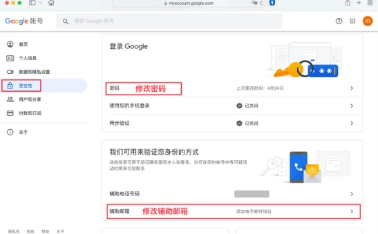 4、在安全性中修改密码和辅助邮箱,建议开启两步验证。