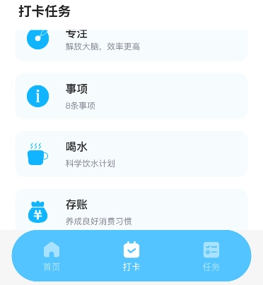 - 任务提醒:可设定提醒时间,自动提示打卡。