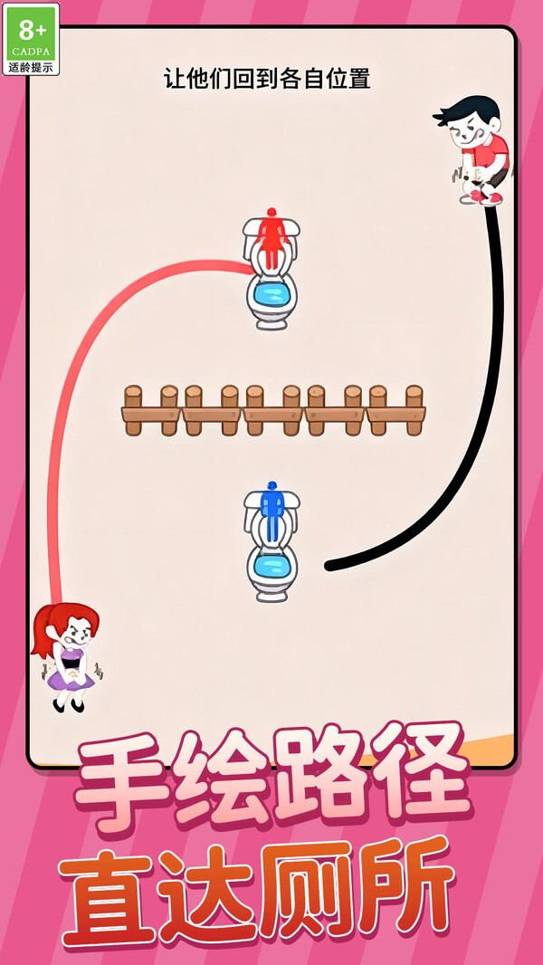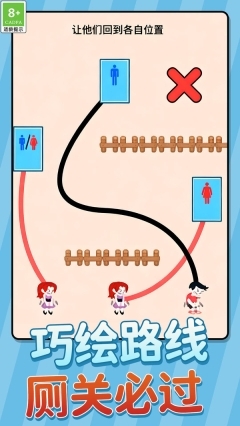 1、以画线寻厕为核心休闲创意玩法,玩法新颖且富有创意,让玩家在轻松画线、规划路径的过程中体验别样的闯关乐趣。