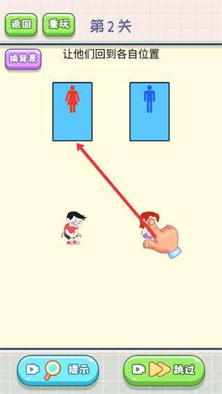2、进入第2关后,依据“让他们回到各自位置”的提示,按照页面指引操控女性角色,朝着对应标识区域移动。