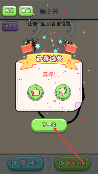 4、当出现“恭喜过关”的弹窗时,点击其中的【下一关】按钮,即可进入该游戏的下一个关卡,继续展开挑战。