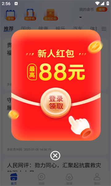 2、进入软件首页后,点击左上角的新人红包,会弹出红包界面,点击领取就行。