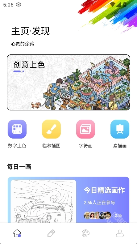 2、打开进入首页可以看到众多功能,包含数字上色、临摹插图、字符画、素描画等
