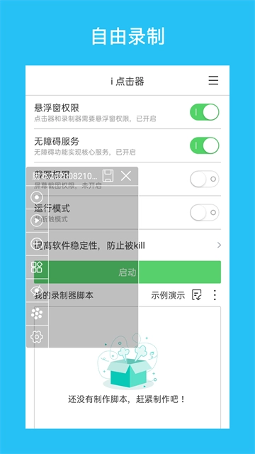 2、想自动抢红包或秒杀?先用录制模式录下点击动作,保存成脚本,到点一键启动,快过手速