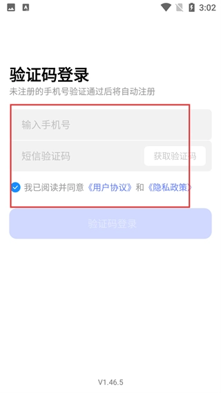3、进入【验证码登录】界面,先输入手机号,再获取并填写短信验证码,同时勾选【《用户协议》和《隐私政策》】。