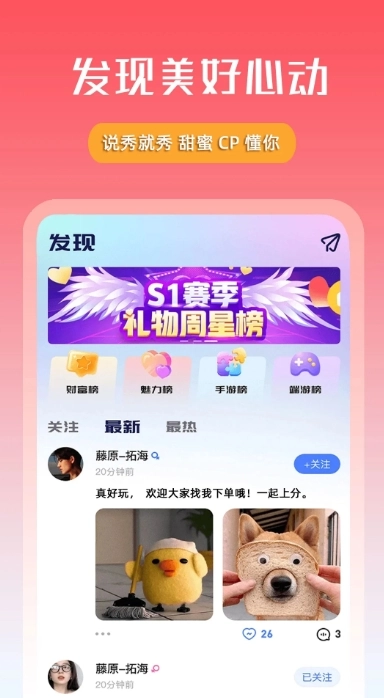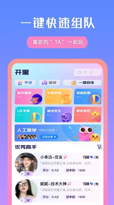 永劫无间、英雄联盟等)众多热门游戏类型不断添加;众多游戏高手不断加入,只为帮您在和游戏电竞高手组队过程中告别无聊,寻找有趣的话题和小姐姐和小哥哥一起吃鸡一起上分,一同开启愉快的游戏之旅。
