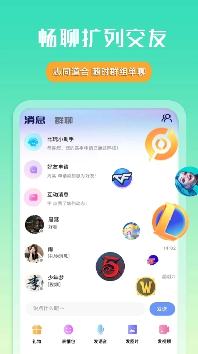 比玩是一款很好玩的语音聊天软件,玩家们在这里可以寻找开黑队友,线上PK唱歌,快速的组局,软件里的用户非常的多,超多小哥哥小姐姐等着你来开黑,快来加入吧!