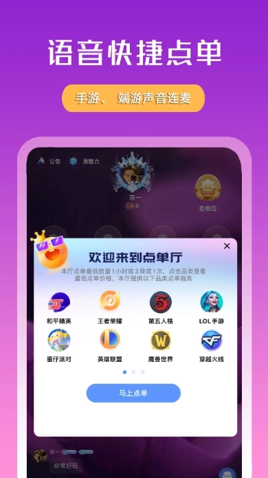 在语音派单厅您可以发布订单找到大神,试听大神的声音,和大神本人对话,和颜值主播互动寻找匹配到适合您的游戏陪练开黑组队搭子。