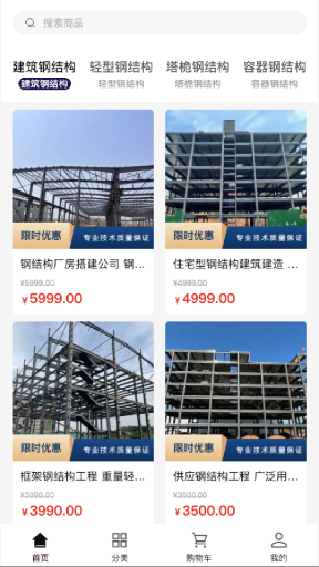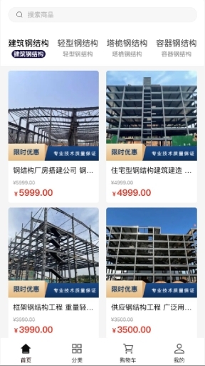 1、进入软件后,能看到钢材已按使用类别完成分类,用户既能依据分类查找钢材,也可借助上方的搜索框搜索商品,选中商品后直接加入购物车即可。