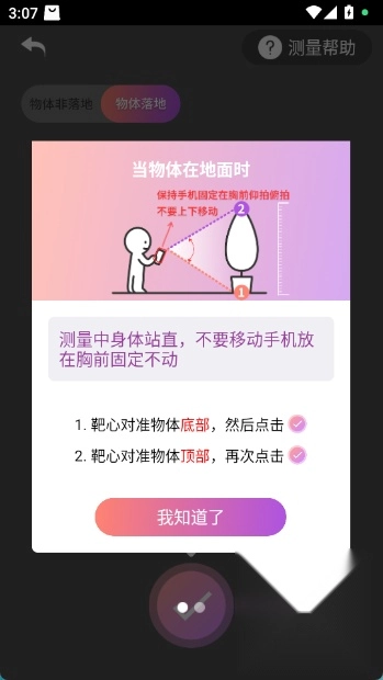 3.确定后测量中身体站直,不要移动手机放在胸前固定不动,首先靶心对准物体底部,然后点击,再靶心对准物体顶部,再次点击