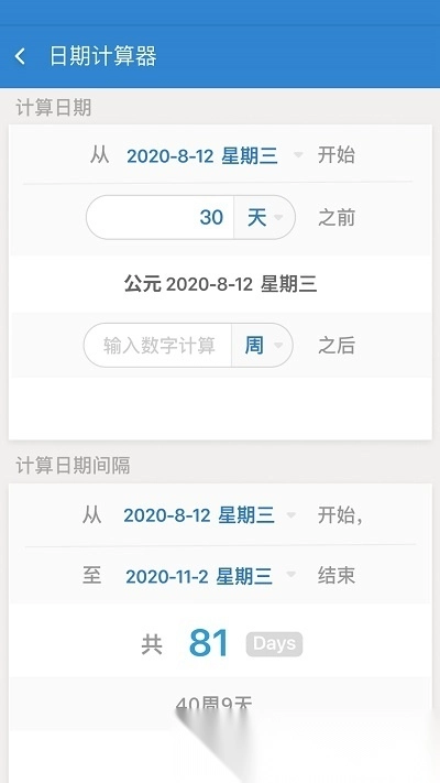 1. 万年历支持:涵盖公元元年至公元9999年的日期计算,方便你统计诸如美国独立日数、交往纪念日数等长远日期;