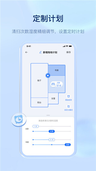 用户可以通过平台的计划管理功能,自主选择需要清扫的房间、设定清扫的次数以及调整拖地的湿度等参数。