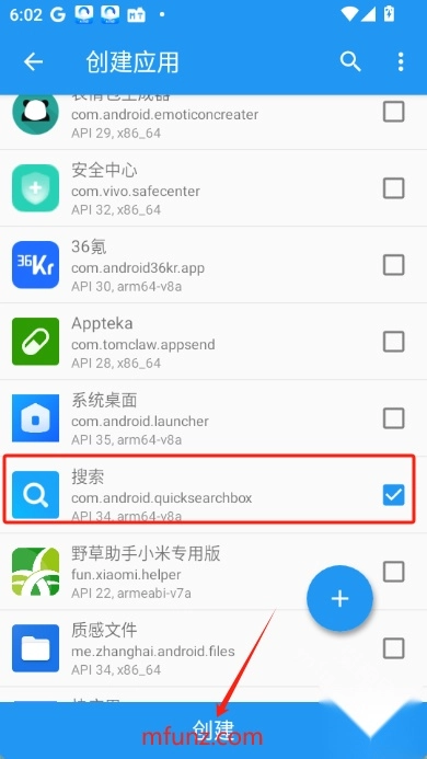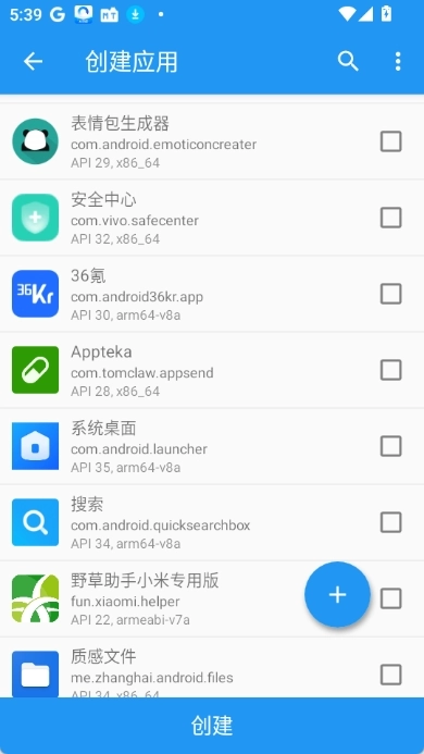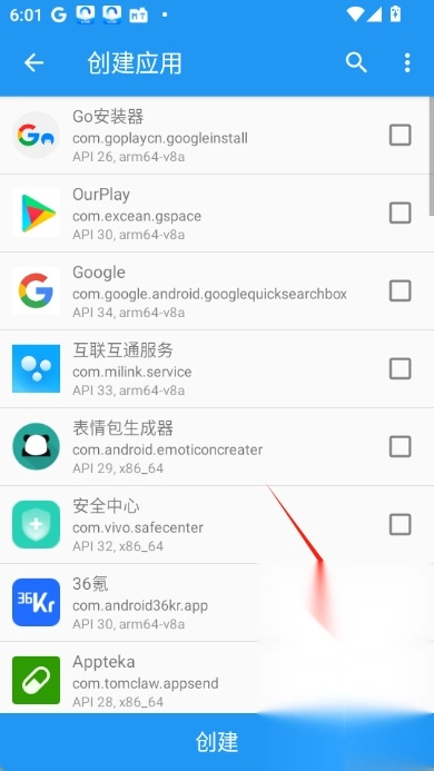 4.从列表中选择需要使用太极模块功能的应用,点击“创建”按钮,太极将创建该应用的虚拟环境。
