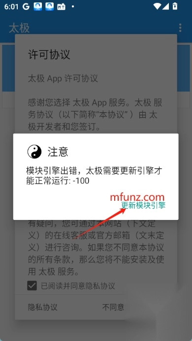 2.如果遇到模块引擎出错的提示,需要更新引擎才能正常运行。点击“更新模块引擎”按钮进行更新