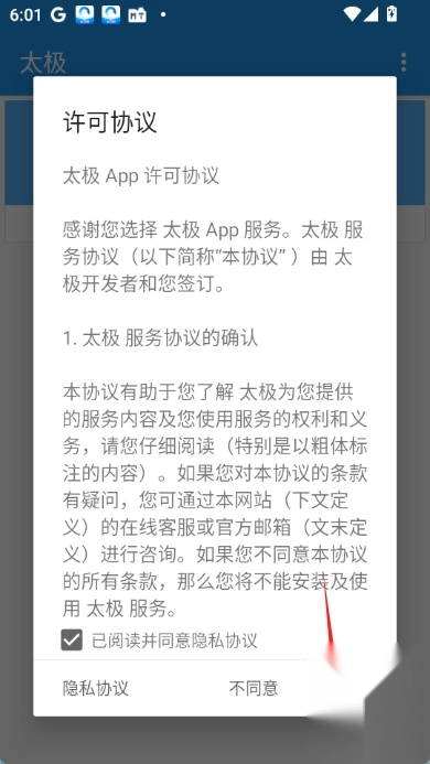 1.打开太极,首先阅读“太极 App 许可协议”。点击“同意”按钮以继续。