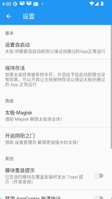 5.在“基本”设置中,可以设置自启动和保持存活选项,确保太极及其创建的应用正常运行。