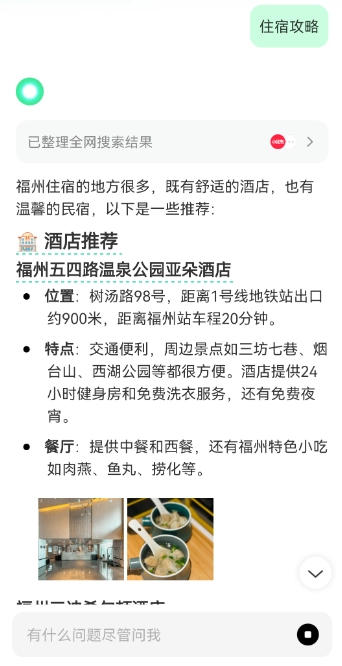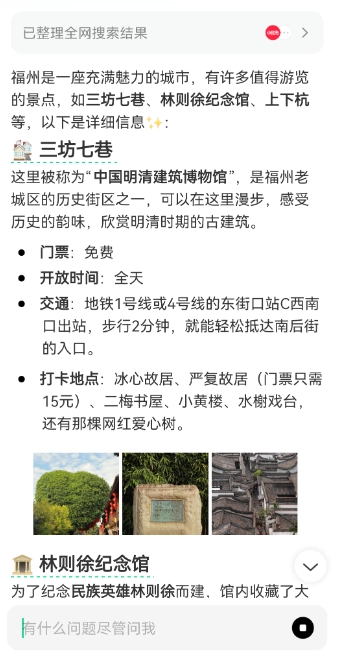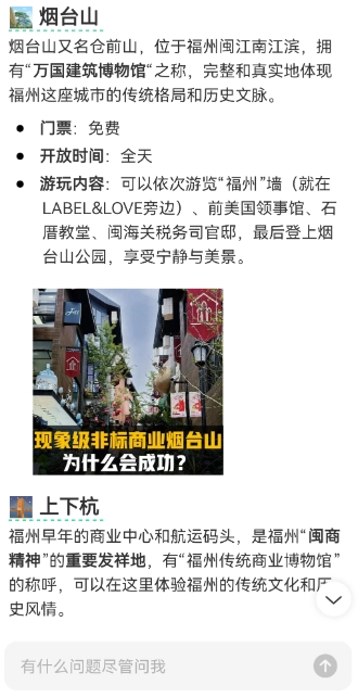 3. 输入文字或利用语音提出需求,如“福州有什么景点”。
