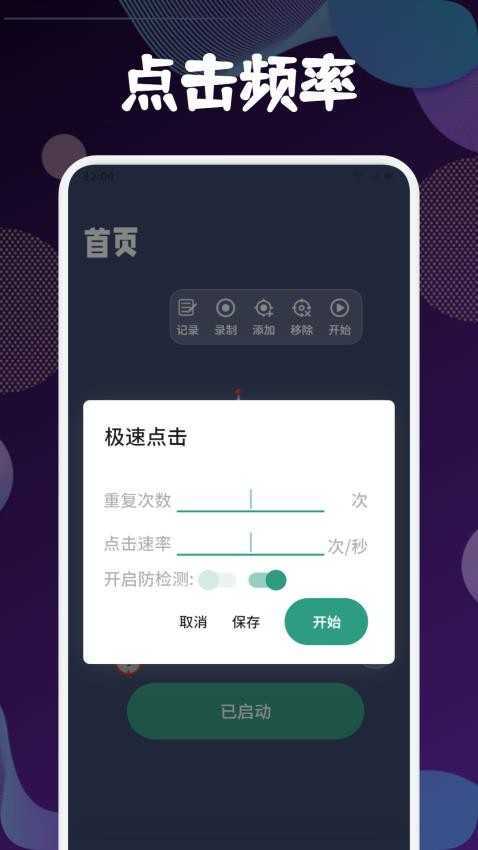 【极速连点】可自由设定点击频率、添加点击坐标、开启自动位置偏移(规避检测),还支持启动延时等功能